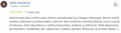Absolvovala jsem s tímto super týmem instruktorský kurz Oxygen Advantage. Musím ocenit skvělou odbornost a profesionální a zároveň velmi srdečný a otevřený přístup, což je vzácná kombinace. Dále taky dobrou a rychlou komunikaci, podporu a vstřícnost. Vřele doporučuju jak klientům k rehabilitaci tak i zájemcům o funkční dýchání. Škoda jen, že je mám daleko 🙂