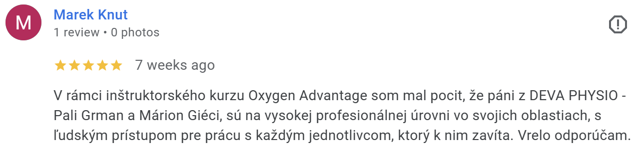 V rámci inštruktorského kurzu Oxygen Advantage som mal pocit, že páni z DEVA PHYSIO - Pali Grman a Márion Giéci, sú na vysokej profesionálnej úrovni vo svojich oblastiach, s ľudským prístupom pre prácu s každým jednotlivcom, ktorý k nim zavíta. Vrelo odporúčam.