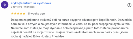 Ďakujem za príjemne strávený deň na kurze oxygene advantage v Topoľčanoch. Dozvedela som sa veľa nových a zaujímavých informácií. A veľmi sa mi páči prepojenie dychu a tela. Na kurze som zistila,že moje dýchanie bolo nesprávne,a preto toto zistenie pokladám za najväčší benefit na moje zdravie. Prajem obom školiteľom nech sa im darí v práci ,ktorú robia aj naďaļej. Erika Hustá z Prievidze