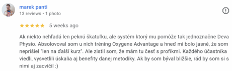Ak niekto nehľadá len peknú škatuľku, ale systém ktorý mu pomôže tak jednoznačne Deva Physio. Absolovoval som u nich tréning Oxygene Advantage a hneď mi bolo jasné, že som neprišiel "len na ďalší kurz". Ale zistil som, že mám tu česť s profíkmi. Každého účastníka viedli, vysvetlili úskalia aj benefity danej metodiky. Ak by som býval bližšie, rád by som si s nimi aj zacvičil 🙂