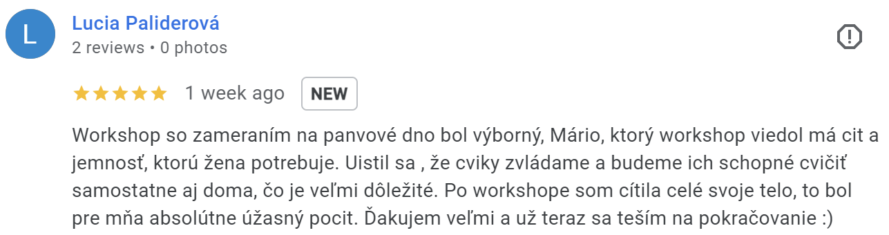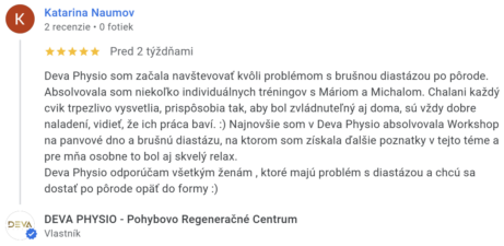 Po dvoch pôrodoch som si chcela spevniť brušné svalstvo, tak som sa rozhodla ísť. Workshop mi pomohol naučiť sa konkrétne cviky a najviac sa mi páčil individuálny prístup fyzioterapeuta. Určite odporúčam aj ostatným ženám zúčastniť sa workshopu.